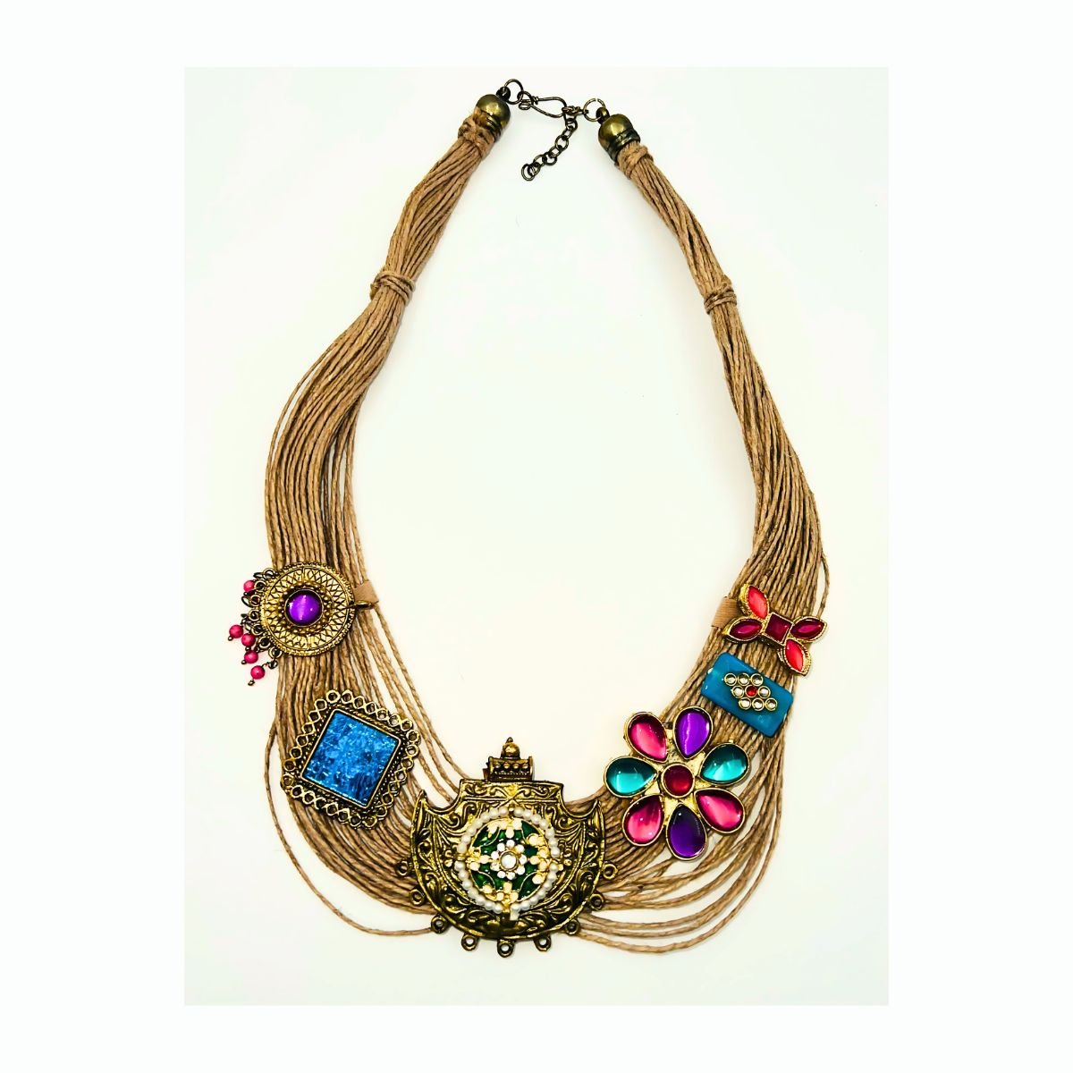Add elegance to your jewellery collection with this Handmade Jute Necklace with Multi-Gemstones. Skillfully crafted with natural jute and vibrant gemstones, this piece features intricate patterns and delicate textures that exude confidence and grace. Perfect for festive occasions or to elevate your everyday look, this necklace adds a unique charm to any outfit.