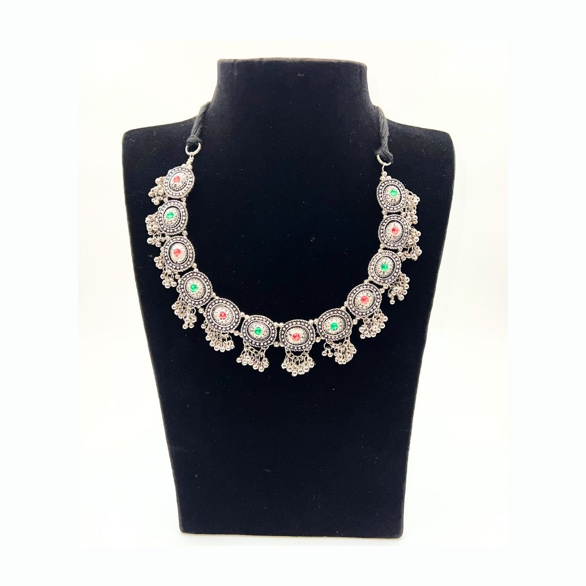 Add elegance to your jewellery collection with this Handcrafted Oxidized Silver Gemstone Necklace. Beautifully crafted with fine fabric, vibrant gemstones, and oxidized silver, this piece reflects a unique artistic style. The intricate patterns and delicate textures are designed to make you feel confident and graceful. Perfect for festive occasions or to enhance your everyday look, this necklace adds charm to any outfit.