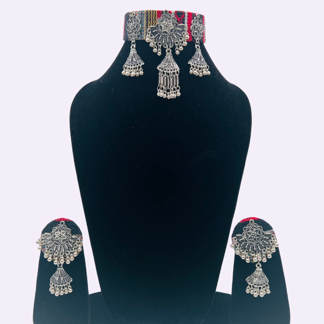 Handcrafted Red Bohemian Silver Choker & Earrings Set