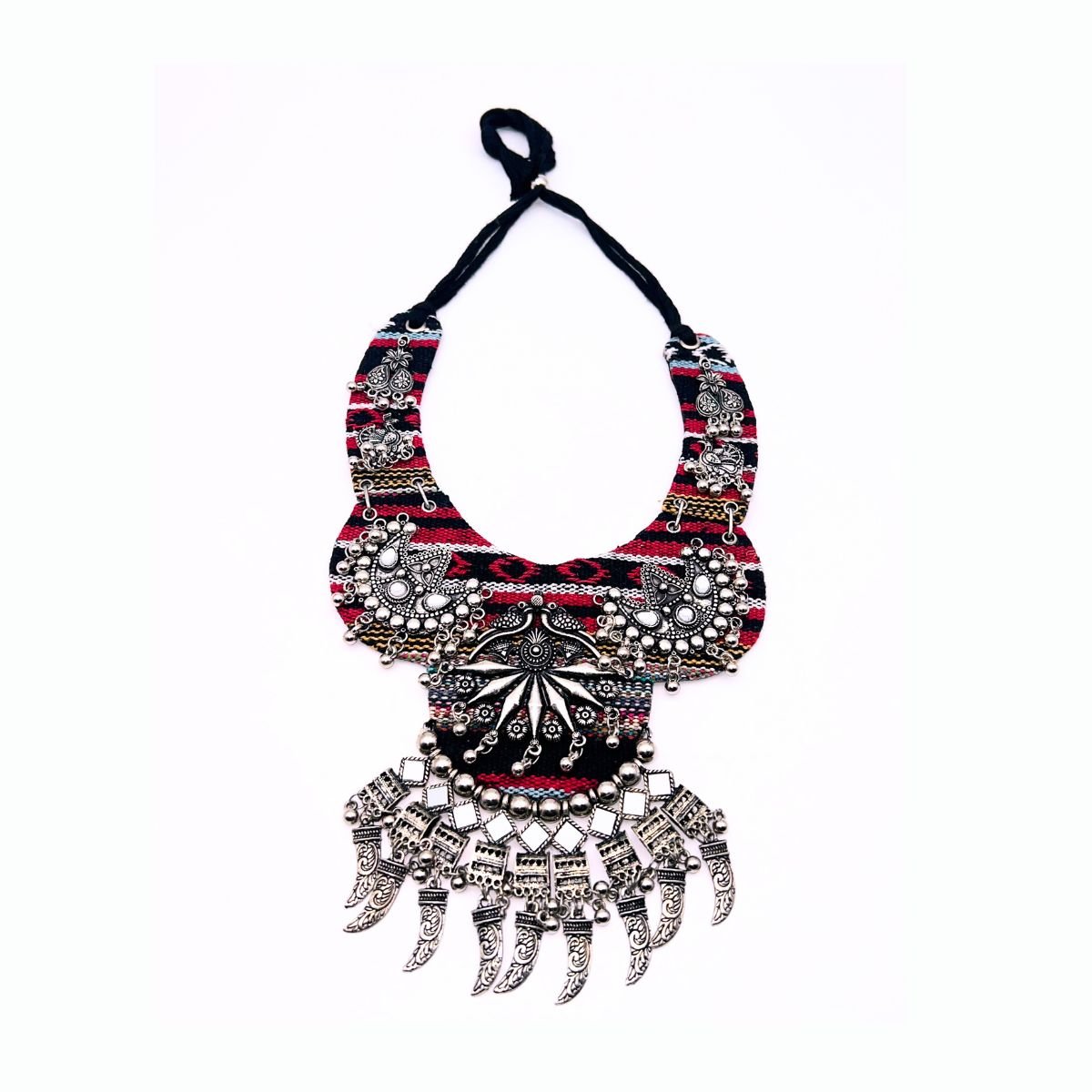 Enhance your look with this bold and captivating Bohemian Oxidized Silver Fabric Necklace designed for the strong and confident woman who loves to make a statement. The intricately detailed oxidized silver pendant sits against a richly textured red and black woven fabric, creating a striking contrast that exudes power and elegance. The delicate mirror accents catch the light with every movement, while the fierce claw-shaped charms add a touch of warrior spirit, making this piece a true embodiment of fearless beauty.