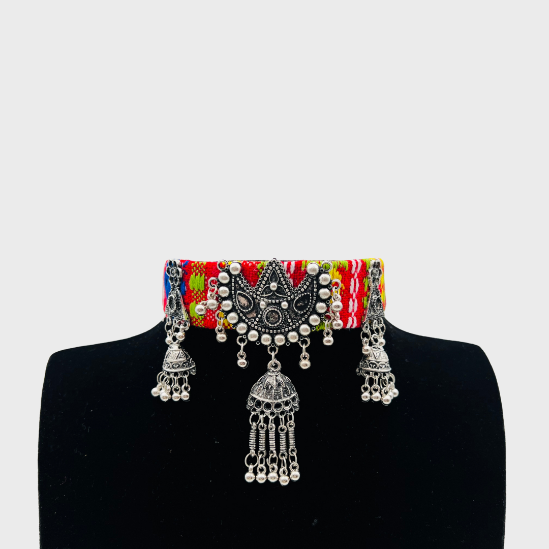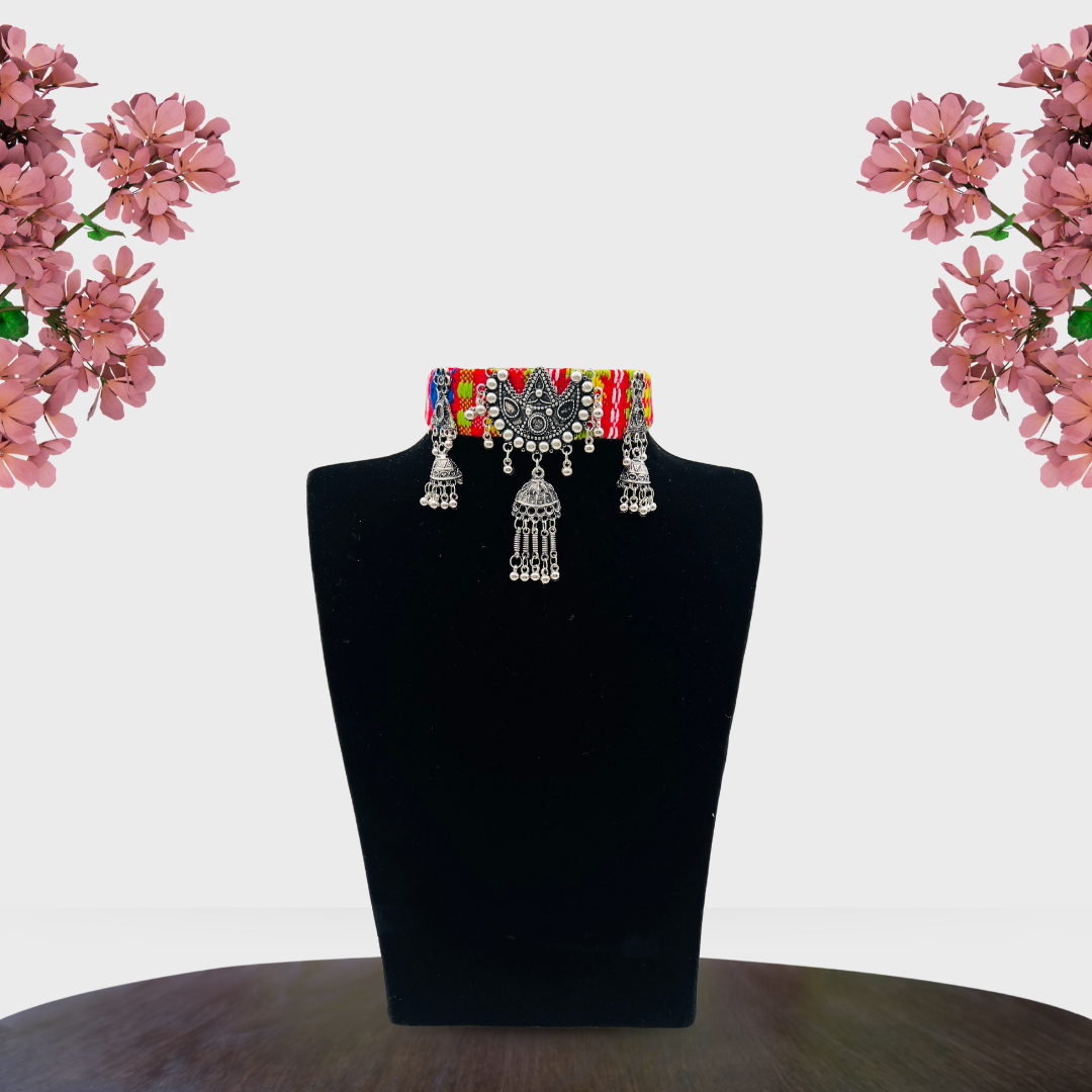Handmade Artistic Multicolor Choker- Oxidized with silver charm and jhumka danglers