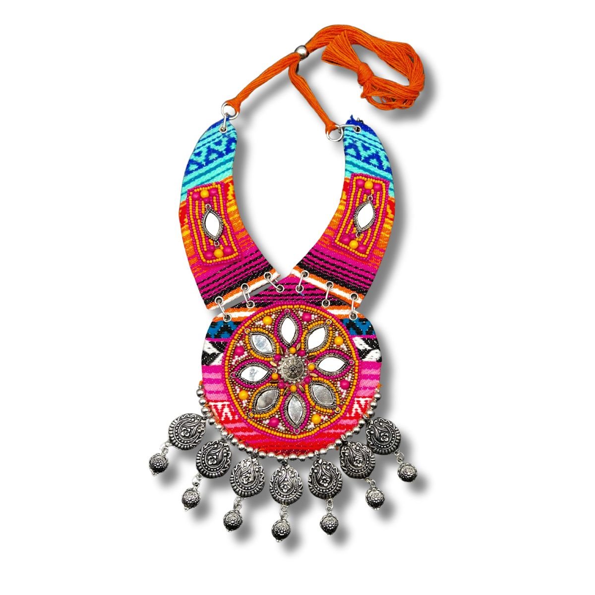 Enhance your jewellery collection with this Handcrafted Boho Tribal Necklace, featuring a vibrant circular pendant with intricate beadwork and oxidized silver embellishments. The bold, multicolored fabric strap adds a unique touch, while the dangling metal charms provide a classic tribal look. Perfect for festive events, traditional gatherings, or to elevate your bohemian outfit, this statement piece is sure to turn heads.